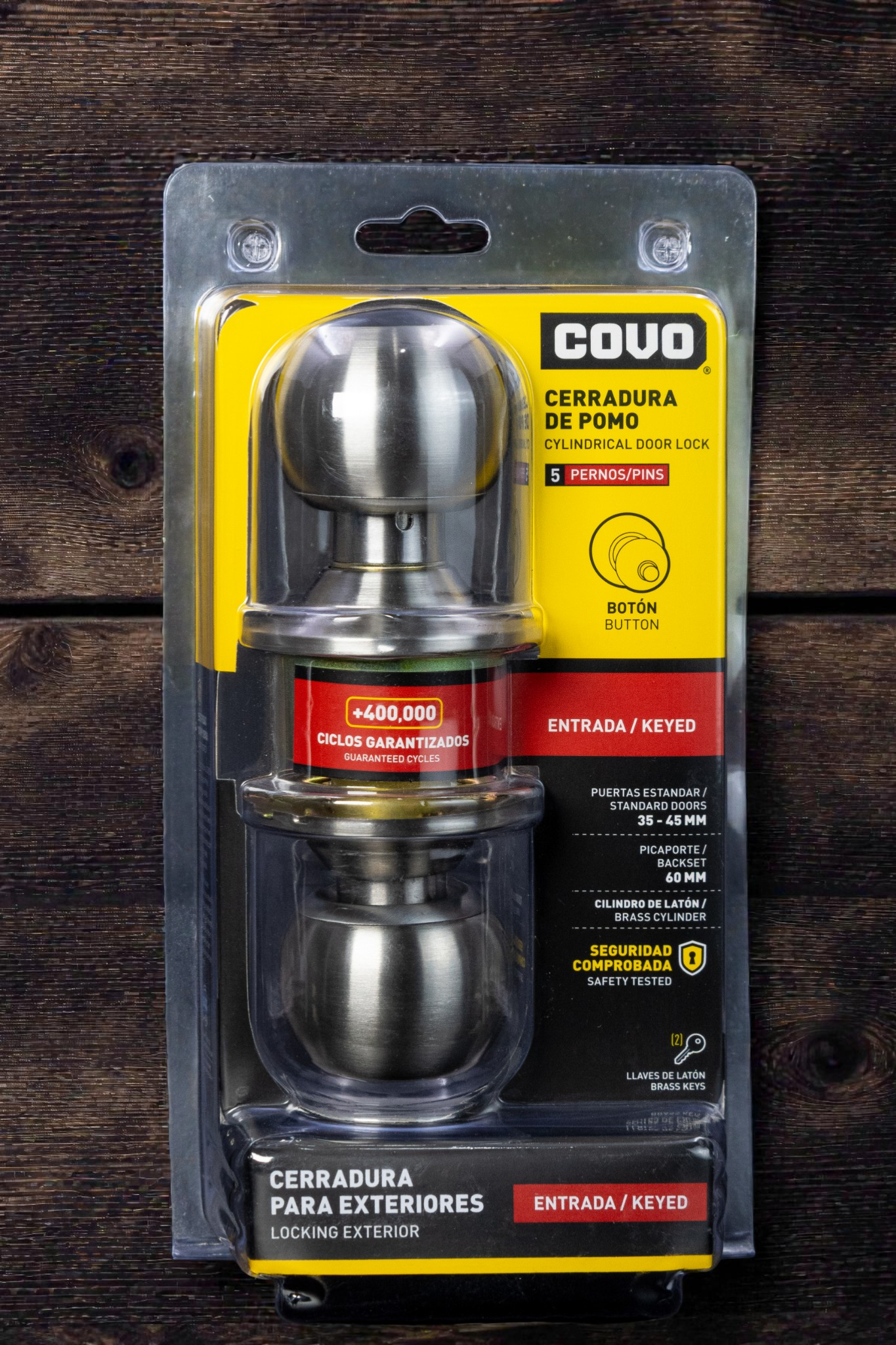 La cerradura de pomo COVO para exteriores es una solución práctica y segura para puertas residenciales o comerciales. Diseñada con sistema cilíndrico de entrada con llave, ofrece un funcionamiento confiable y resistente al uso continuo. Fabricada en acero inoxidable con cilindro de latón y sistema de 5 pernos, garantiza mayor seguridad y durabilidad. Su diseño tipo botón permite un uso sencillo desde el interior, mientras que su estructura robusta soporta más de 400.000 ciclos de uso, ideal para puertas de alto tráfico.