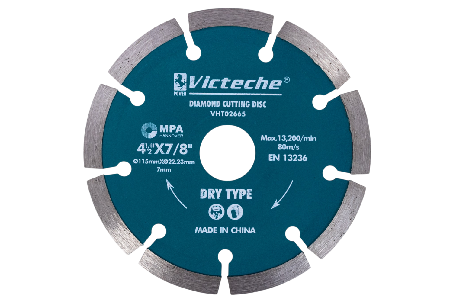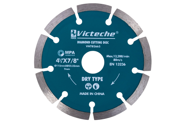 Disco de corte diamantado Victeche 4 1/2 pulgadas modelo VHT02665, ideal para trabajos de construcción y remodelación que requieren cortes rápidos, limpios y precisos. Su diseño segmentado permite mejor ventilación y mayor rendimiento en uso continuo, siendo una excelente opción tanto para profesionales como para uso doméstico.