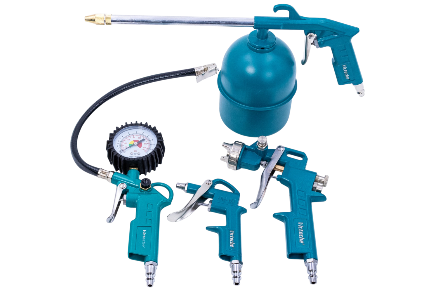 El Kit de Herramientas Neumáticas Victeche 5 Piezas es la solución ideal para trabajos con compresor en el taller, garaje o industria. Diseñado para ofrecer versatilidad y rendimiento, incluye las herramientas esenciales para inflar, limpiar, lavar y pulverizar con aire comprimido, brindando practicidad y eficiencia en un solo kit.